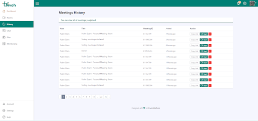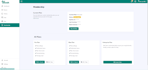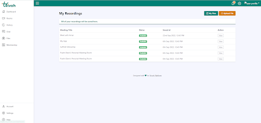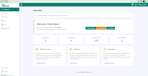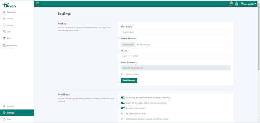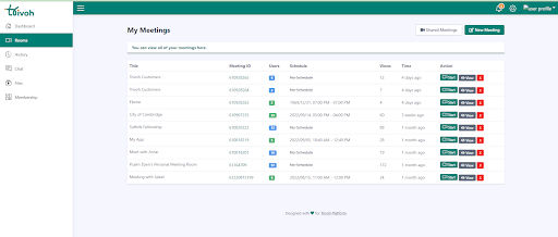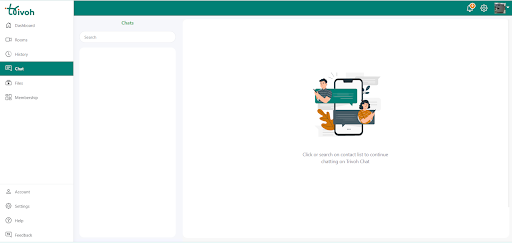 Everything you do on Trivoh happens in a workspace. It’s where you’ll find your Dashboard, Rooms (meeting details), History, Chat, Files, Membership, Account, Settings and Team members